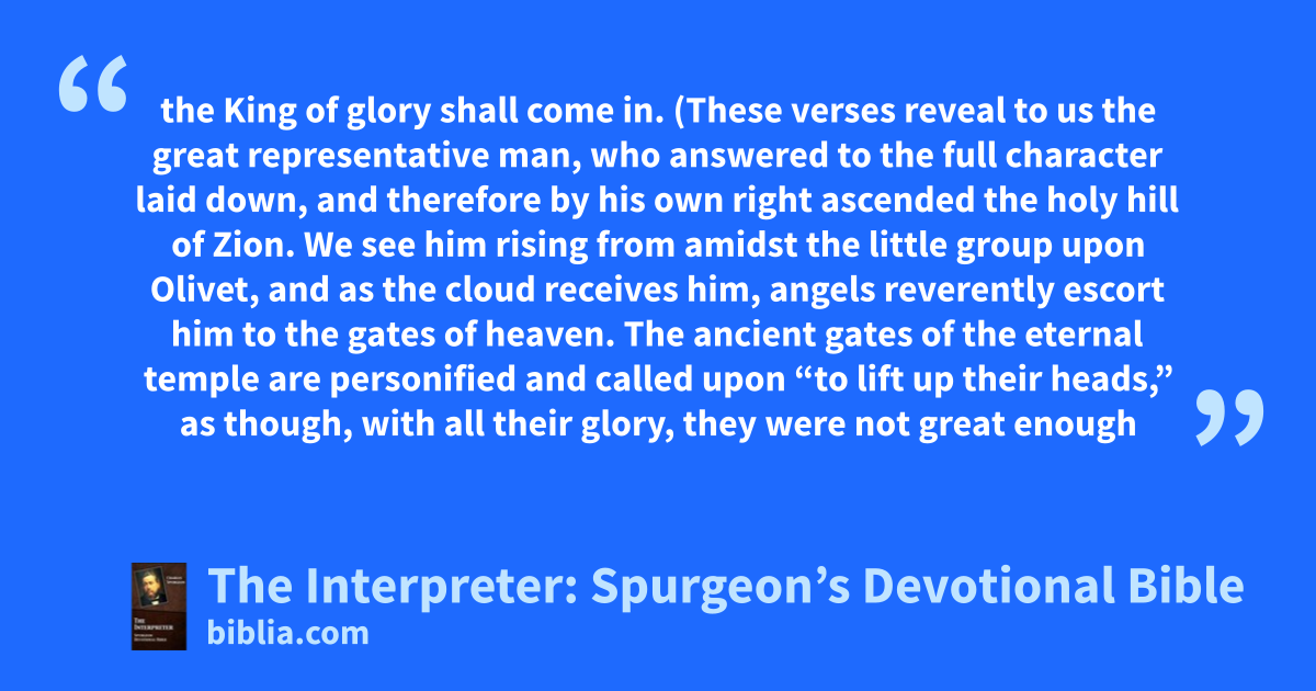 the King of glory shall come in. (These verses reveal to us the great representative man, who answered to the full character laid down, and therefore by his own right ascended the holy hill of Zion. We see him rising from amidst the little group upon Olivet, and as the cloud receives him, angels reverently escort him to the gates of heaven. The ancient gates of the eternal temple are personified and called upon “to lift up their heads,” as though, with all their glory, they were not great enough