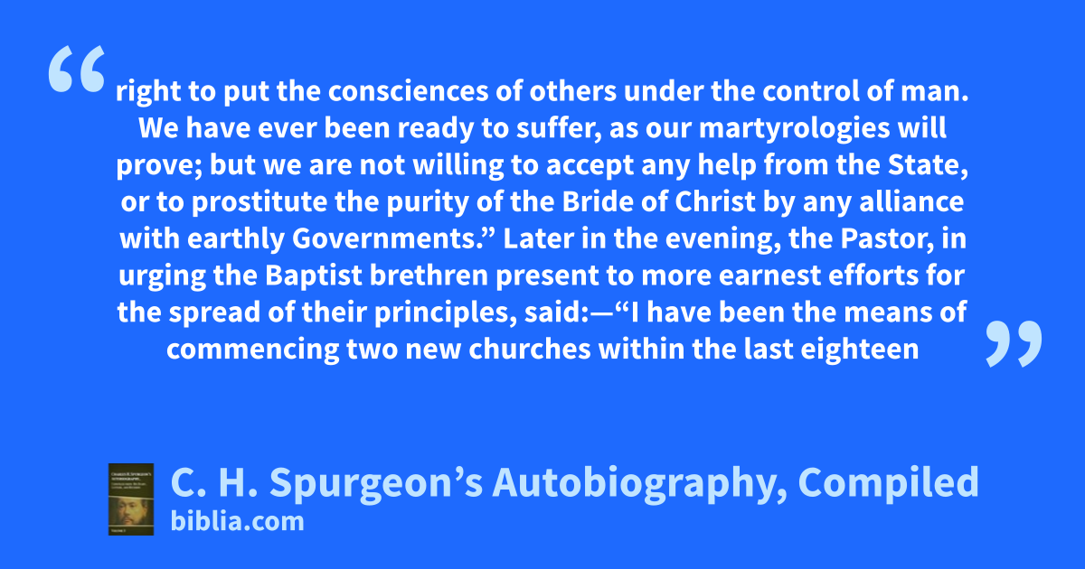 right to put the consciences of others under the control of man. We have ever been ready to suffer, as our martyrologies will prove; but we are not willing to accept any help from the State, or to prostitute the purity of the Bride of Christ by any alliance with earthly Governments.” Later in the evening, the Pastor, in urging the Baptist brethren present to more earnest efforts for the spread of their principles, said:—“I have been the means of commencing two new churches within the last eighteen