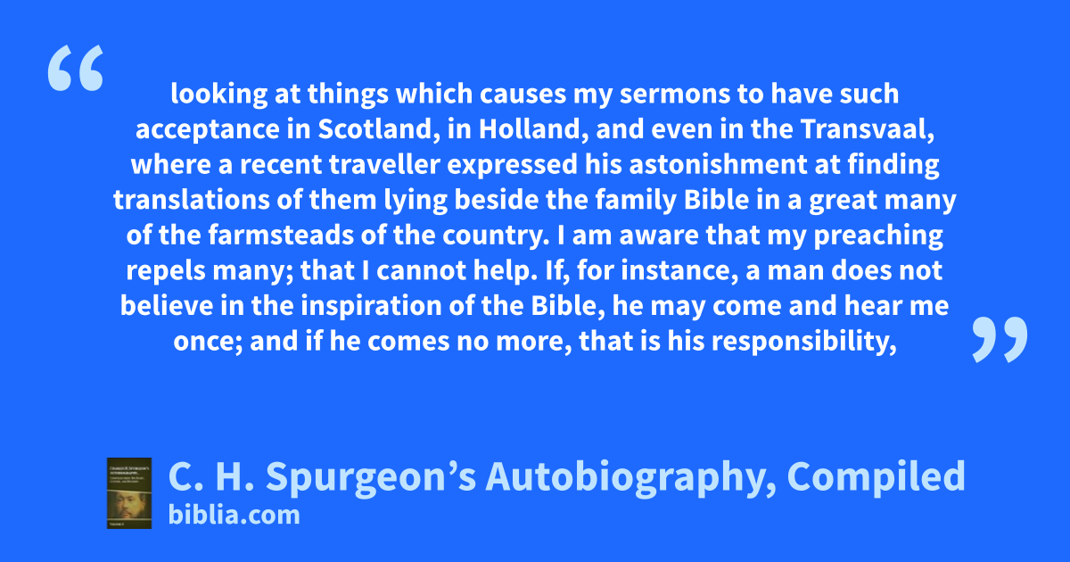 looking at things which causes my sermons to have such acceptance in Scotland, in Holland, and even in the Transvaal, where a recent traveller expressed his astonishment at finding translations of them lying beside the family Bible in a great many of the farmsteads of the country. I am aware that my preaching repels many; that I cannot help. If, for instance, a man does not believe in the inspiration of the Bible, he may come and hear me once; and if he comes no more, that is his responsibility,