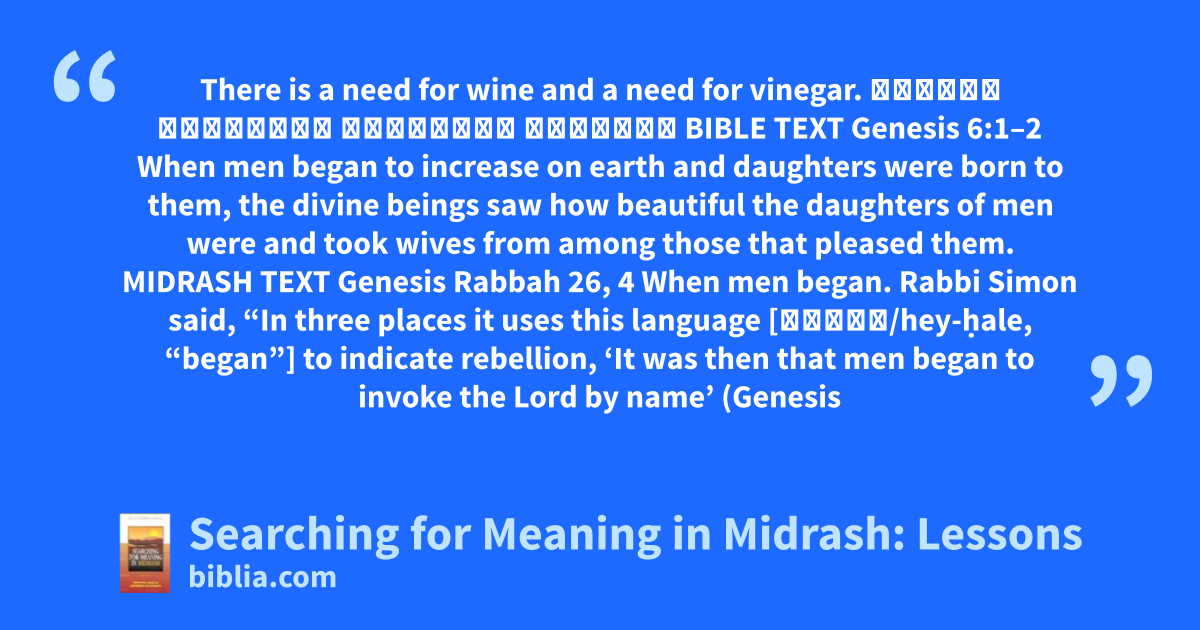 There is a need for wine and a need for vinegar. צֹרֶךְ לַיַּיִן וְצֹרֶךְ לַחֹמֶץ BIBLE TEXT Genesis 6:1–2 When men began to increase on earth and daughters were born to them, the divine beings saw how beautiful the daughters of men were and took wives from among those that pleased them. MIDRASH TEXT Genesis Rabbah 26, 4 When men began. Rabbi Simon said, “In three places it uses this language [הֵחֵל/hey-ḥale, “began”] to indicate rebellion, ‘It was then that men began to invoke the Lord by name’ (Genesis