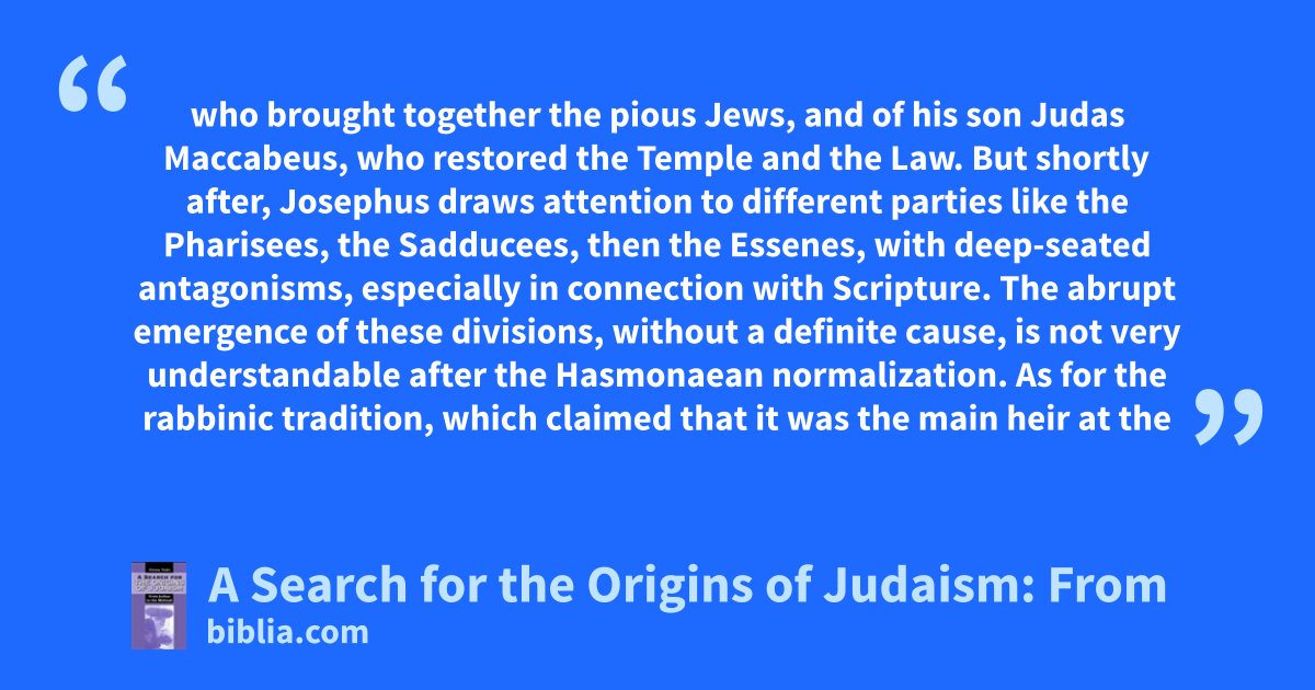 who brought together the pious Jews, and of his son Judas Maccabeus, who restored the Temple and the Law. But shortly after, Josephus draws attention to different parties like the Pharisees, the Sadducees, then the Essenes, with deep-seated antagonisms, especially in connection with Scripture. The abrupt emergence of these divisions, without a definite cause, is not very understandable after the Hasmonaean normalization. As for the rabbinic tradition, which claimed that it was the main heir at the
