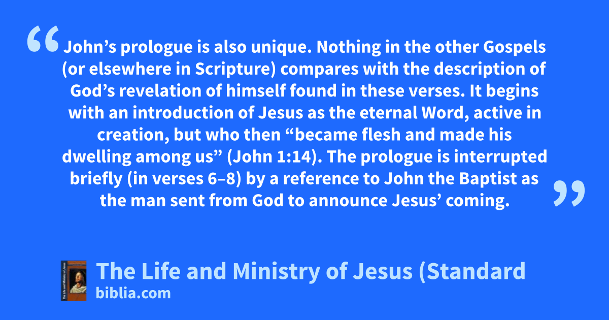 John’s prologue is also unique. Nothing in the other Gospels (or elsewhere in Scripture) compares with the description of God’s revelation of himself found in these verses. It begins with an introduction of Jesus as the eternal Word, active in creation, but who then “became flesh and made his dwelling among us” (John 1:14). The prologue is interrupted briefly (in verses 6–8) by a reference to John the Baptist as the man sent from God to announce Jesus’ coming.