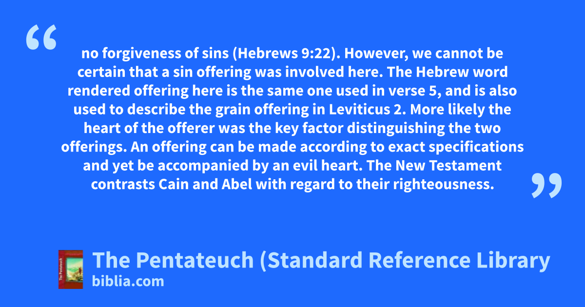 no forgiveness of sins (Hebrews 9:22). However, we cannot be certain that a sin offering was involved here. The Hebrew word rendered offering here is the same one used in verse 5, and is also used to describe the grain offering in Leviticus 2. More likely the heart of the offerer was the key factor distinguishing the two offerings. An offering can be made according to exact specifications and yet be accompanied by an evil heart. The New Testament contrasts Cain and Abel with regard to their righteousness.