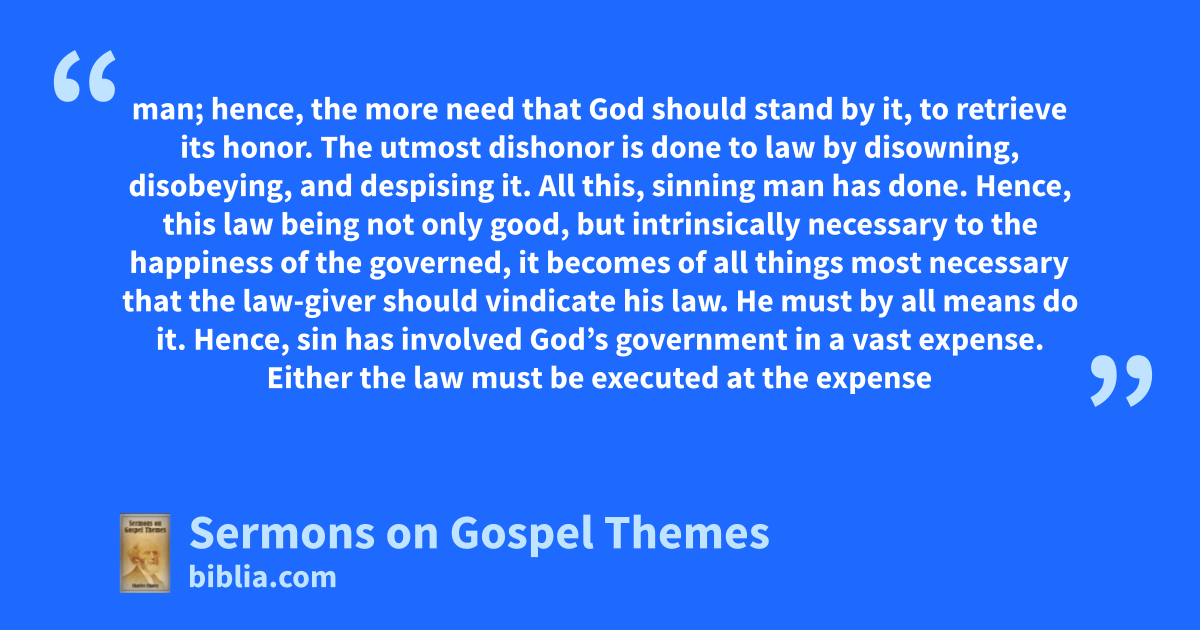 man; hence, the more need that God should stand by it, to retrieve its honor. The utmost dishonor is done to law by disowning, disobeying, and despising it. All this, sinning man has done. Hence, this law being not only good, but intrinsically necessary to the happiness of the governed, it becomes of all things most necessary that the law-giver should vindicate his law. He must by all means do it. Hence, sin has involved God’s government in a vast expense. Either the law must be executed at the expense