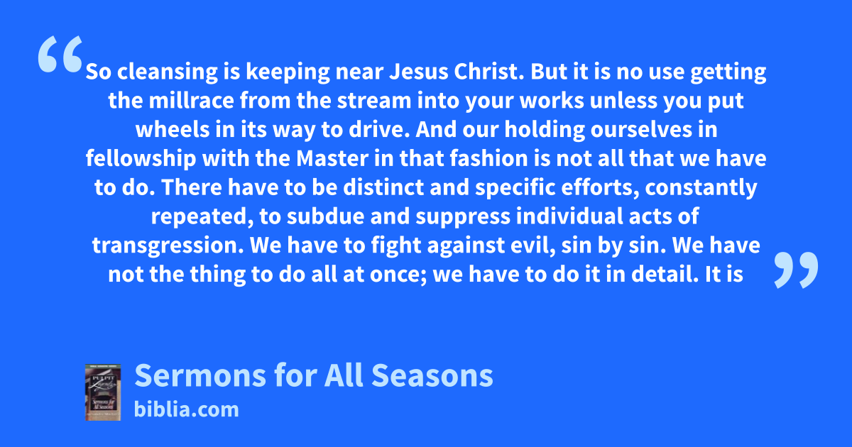 So cleansing is keeping near Jesus Christ. But it is no use getting the millrace from the stream into your works unless you put wheels in its way to drive. And our holding ourselves in fellowship with the Master in that fashion is not all that we have to do. There have to be distinct and specific efforts, constantly repeated, to subdue and suppress individual acts of transgression. We have to fight against evil, sin by sin. We have not the thing to do all at once; we have to do it in detail. It is