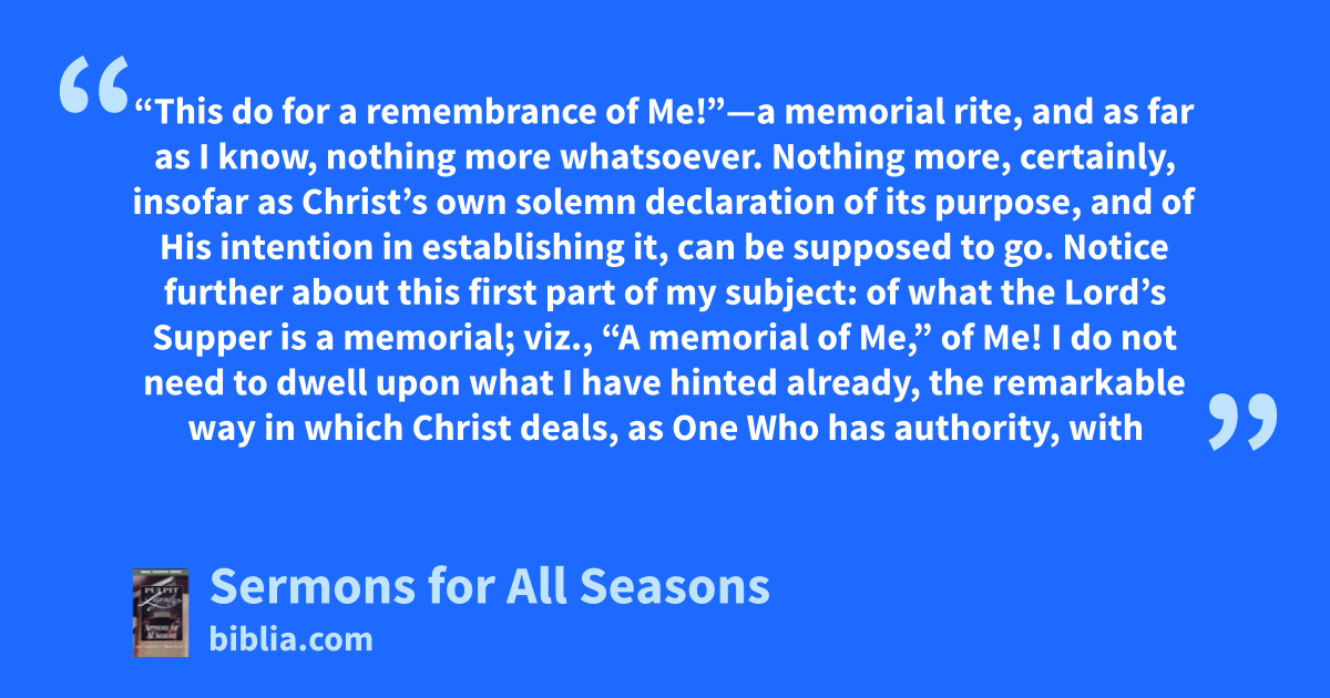 “This do for a remembrance of Me!”—a memorial rite, and as far as I know, nothing more whatsoever. Nothing more, certainly, insofar as Christ’s own solemn declaration of its purpose, and of His intention in establishing it, can be supposed to go. Notice further about this first part of my subject: of what the Lord’s Supper is a memorial; viz., “A memorial of Me,” of Me! I do not need to dwell upon what I have hinted already, the remarkable way in which Christ deals, as One Who has authority, with
