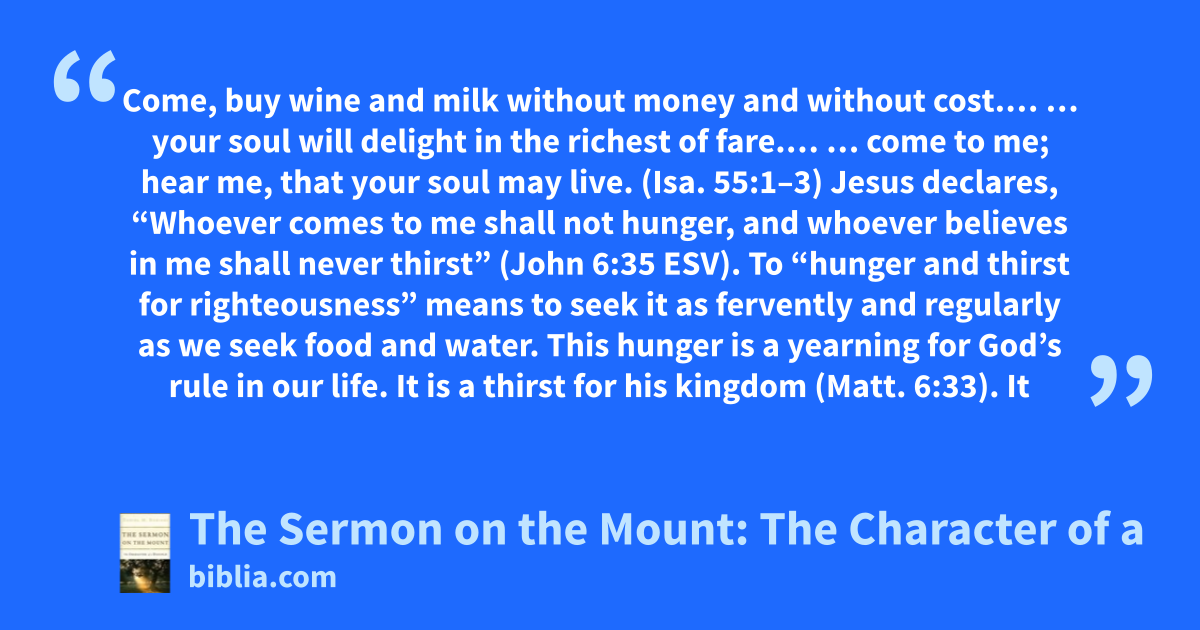 Come, buy wine and milk without money and without cost.… … your soul will delight in the richest of fare.… … come to me; hear me, that your soul may live. (Isa. 55:1–3) Jesus declares, “Whoever comes to me shall not hunger, and whoever believes in me shall never thirst” (John 6:35 ESV). To “hunger and thirst for righteousness” means to seek it as fervently and regularly as we seek food and water. This hunger is a yearning for God’s rule in our life. It is a thirst for his kingdom (Matt. 6:33). It