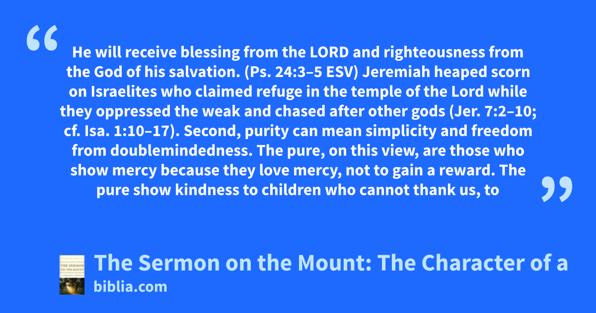 He will receive blessing from the LORD and righteousness from the God of his salvation. (Ps. 24:3–5 ESV) Jeremiah heaped scorn on Israelites who claimed refuge in the temple of the Lord while they oppressed the weak and chased after other gods (Jer. 7:2–10; cf. Isa. 1:10–17). Second, purity can mean simplicity and freedom from doublemindedness. The pure, on this view, are those who show mercy because they love mercy, not to gain a reward. The pure show kindness to children who cannot thank us, to