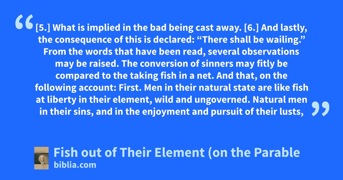 [5.] What is implied in the bad being cast away. [6.] And lastly, the consequence of this is declared: “There shall be wailing.” From the words that have been read, several observations may be raised. The conversion of sinners may fitly be compared to the taking fish in a net. And that, on the following account: First. Men in their natural state are like fish at liberty in their element, wild and ungoverned. Natural men in their sins, and in the enjoyment and pursuit of their lusts,