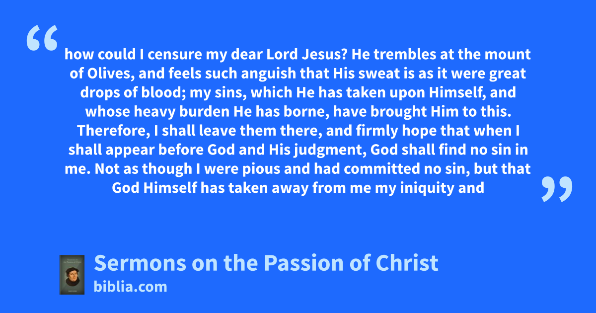 how could I censure my dear Lord Jesus? He trembles at the mount of Olives, and feels such anguish that His sweat is as it were great drops of blood; my sins, which He has taken upon Himself, and whose heavy burden He has borne, have brought Him to this. Therefore, I shall leave them there, and firmly hope that when I shall appear before God and His judgment, God shall find no sin in me. Not as though I were pious and had committed no sin, but that God Himself has taken away from me my iniquity and