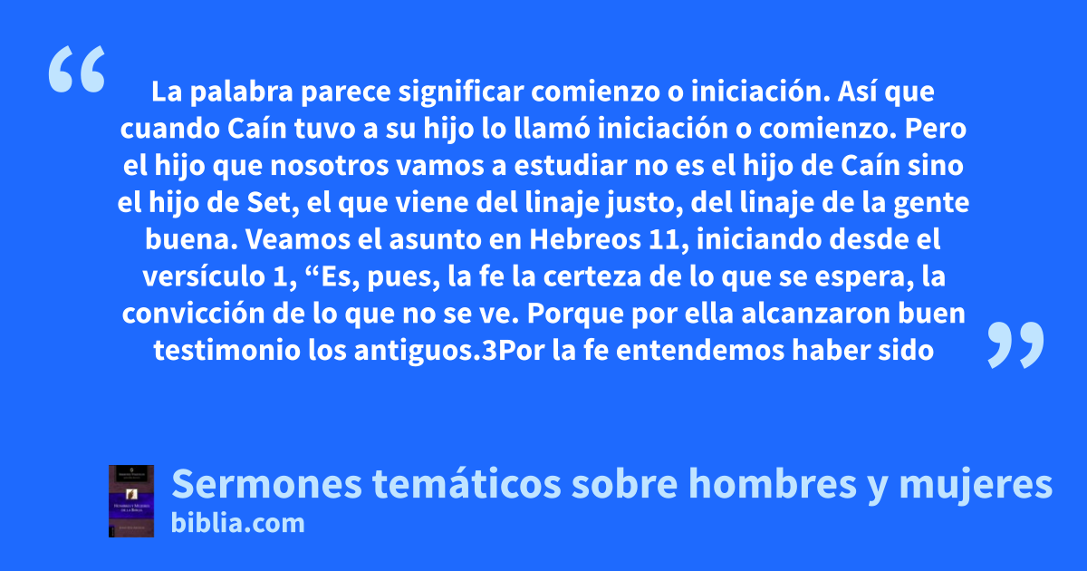 La palabra parece significar comienzo o iniciación. Así que cuando Caín tuvo a su hijo lo llamó iniciación o comienzo. Pero el hijo que nosotros vamos a estudiar no es el hijo de Caín sino el hijo de Set, el que viene del linaje justo, del linaje de la gente buena. Veamos el asunto en Hebreos 11, iniciando desde el versículo 1, “Es, pues, la fe la certeza de lo que se espera, la convicción de lo que no se ve. Porque por ella alcanzaron buen testimonio los antiguos.3Por la fe entendemos haber sido