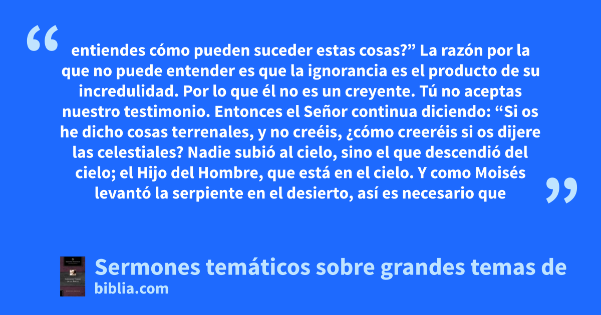 entiendes cómo pueden suceder estas cosas?” La razón por la que no puede entender es que la ignorancia es el producto de su incredulidad. Por lo que él no es un creyente. Tú no aceptas nuestro testimonio. Entonces el Señor continua diciendo: “Si os he dicho cosas terrenales, y no creéis, ¿cómo creeréis si os dijere las celestiales? Nadie subió al cielo, sino el que descendió del cielo; el Hijo del Hombre, que está en el cielo. Y como Moisés levantó la serpiente en el desierto, así es necesario que