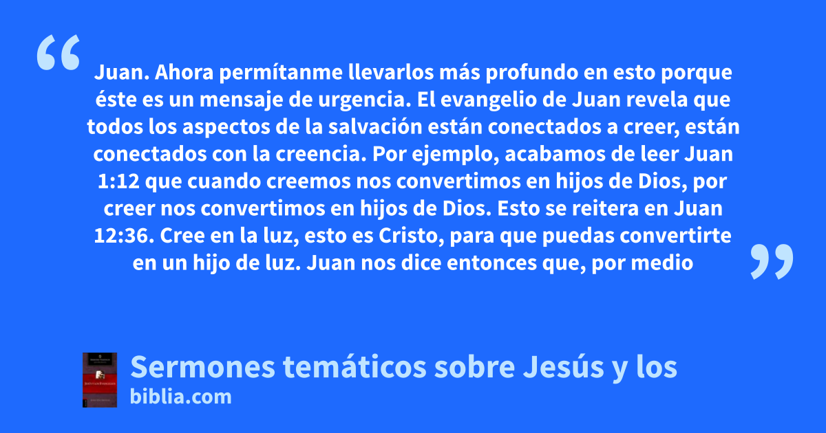 Juan. Ahora permítanme llevarlos más profundo en esto porque éste es un mensaje de urgencia. El evangelio de Juan revela que todos los aspectos de la salvación están conectados a creer, están conectados con la creencia. Por ejemplo, acabamos de leer Juan 1:12 que cuando creemos nos convertimos en hijos de Dios, por creer nos convertimos en hijos de Dios. Esto se reitera en Juan 12:36. Cree en la luz, esto es Cristo, para que puedas convertirte en un hijo de luz. Juan nos dice entonces que, por medio