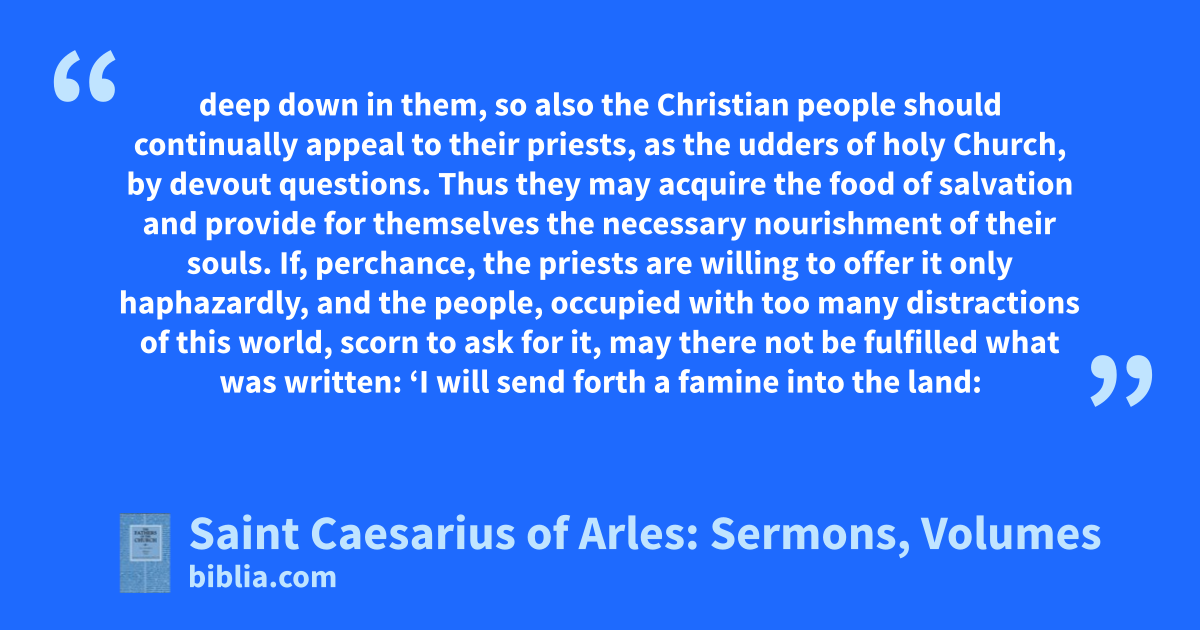 deep down in them, so also the Christian people should continually appeal to their priests, as the udders of holy Church, by devout questions. Thus they may acquire the food of salvation and provide for themselves the necessary nourishment of their souls. If, perchance, the priests are willing to offer it only haphazardly, and the people, occupied with too many distractions of this world, scorn to ask for it, may there not be fulfilled what was written: ‘I will send forth a famine into the land: