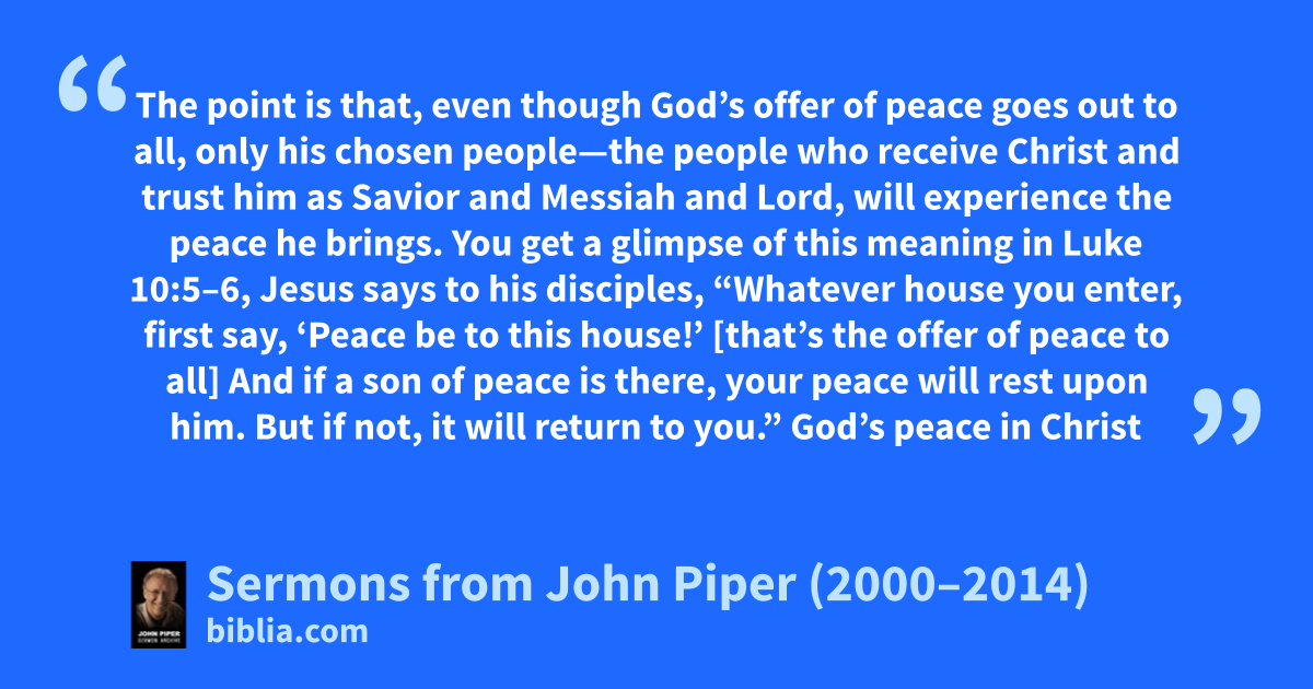 The point is that, even though God’s offer of peace goes out to all, only his chosen people—the people who receive Christ and trust him as Savior and Messiah and Lord, will experience the peace he brings. You get a glimpse of this meaning in Luke 10:5–6, Jesus says to his disciples, “Whatever house you enter, first say, ‘Peace be to this house!’ [that’s the offer of peace to all] And if a son of peace is there, your peace will rest upon him. But if not, it will return to you.” God’s peace in Christ