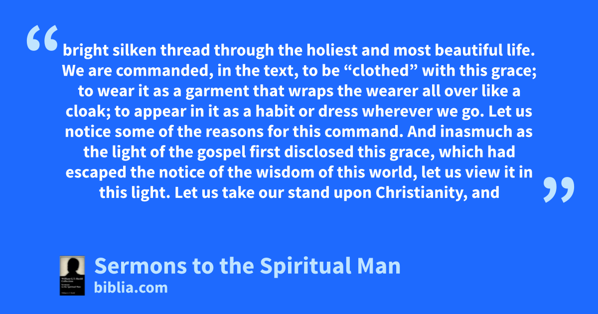 bright silken thread through the holiest and most beautiful life. We are commanded, in the text, to be “clothed” with this grace; to wear it as a garment that wraps the wearer all over like a cloak; to appear in it as a habit or dress wherever we go. Let us notice some of the reasons for this command. And inasmuch as the light of the gospel first disclosed this grace, which had escaped the notice of the wisdom of this world, let us view it in this light. Let us take our stand upon Christianity, and