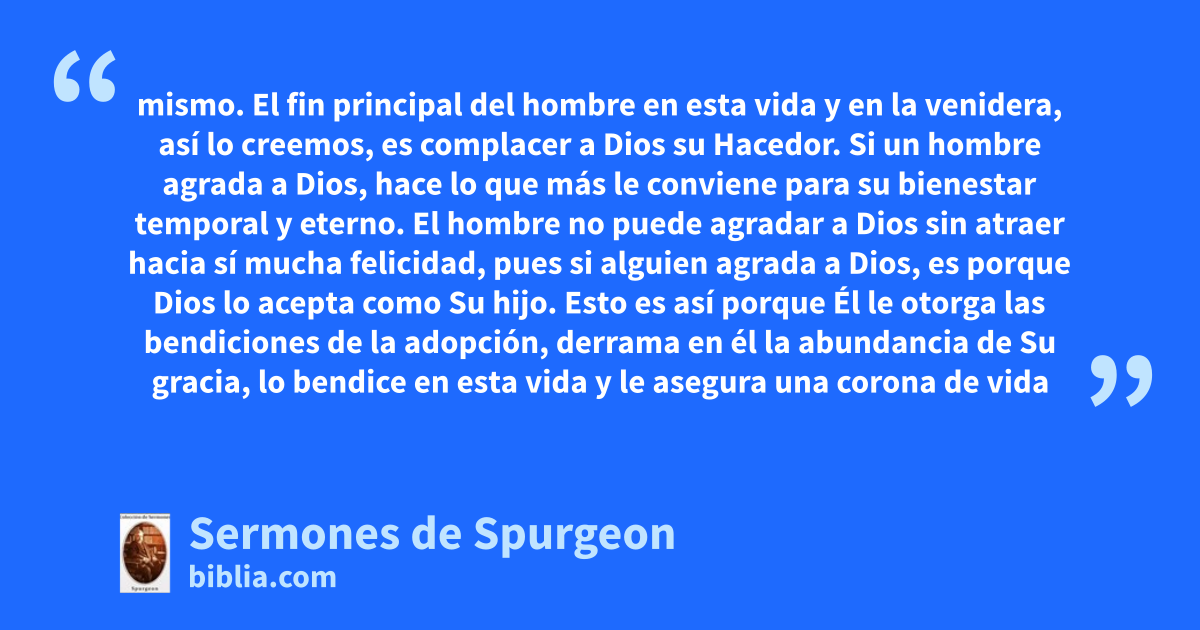 mismo. El fin principal del hombre en esta vida y en la venidera, así lo creemos, es complacer a Dios su Hacedor. Si un hombre agrada a Dios, hace lo que más le conviene para su bienestar temporal y eterno. El hombre no puede agradar a Dios sin atraer hacia sí mucha felicidad, pues si alguien agrada a Dios, es porque Dios lo acepta como Su hijo. Esto es así porque Él le otorga las bendiciones de la adopción, derrama en él la abundancia de Su gracia, lo bendice en esta vida y le asegura una corona de vida