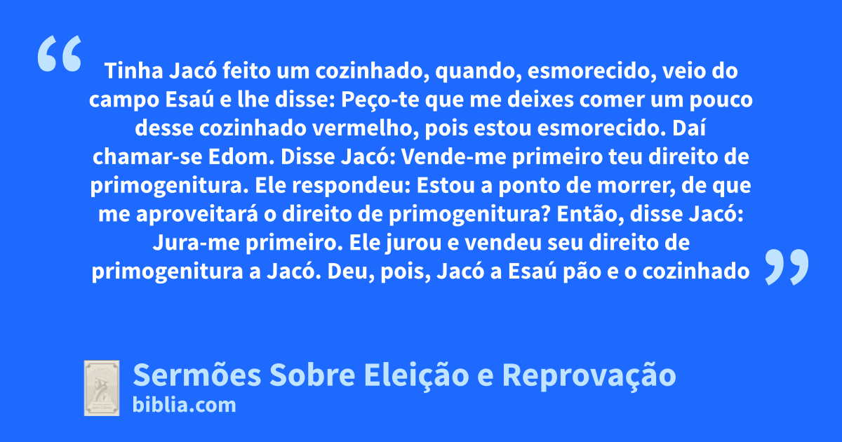 Ao contrário disso, Esaú de outra coisa não cuidava senão de seu ventre; e ele mostra isso muito bem quando diz: “Estou a ponto de morrer, de que me aproveitará o direito de primogenitura?”. Sim, mas este [direito] visava à vida eterna, apontava para a herança celestial. No entanto, ele não tinha consideração por nada disso. Assim, pois, vemos que ele comeu como um cão [desvairado], ou, melhor, como um cão que mantém sempre seu focinho nos restos de comida, nada mais busca senão comer. Eis, pois, a disposição de Esaú, a qual nos é declarada nestes termos. E assim a exortação do apóstolo deve ser bem aproveitada por nós, ao dizer: “nem haja algum impuro ou profano, como foi Esaú” [Hb 12.16]. Pois vemos qual é a causa que nos leva a renunciar a esperança daquela salvação que Deus nos deu: quando nos deixamos enredar em nossos próprios sentidos, e em nossos desejos carnais, é indubitável que não temos nenhuma familiaridade com aquilo que pertence à salvação de nossas almas, a qual não desfruta de estima em nós; de sorte que não há nem palavra de Deus, nem promessa, nem qualquer outra coisa que estimemos levianamente quando somos tão profanos.