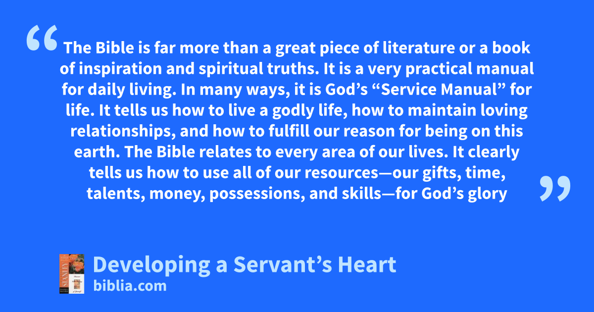 The Bible is far more than a great piece of literature or a book of inspiration and spiritual truths. It is a very practical manual for daily living. In many ways, it is God’s “Service Manual” for life. It tells us how to live a godly life, how to maintain loving relationships, and how to fulfill our reason for being on this earth. The Bible relates to every area of our lives. It clearly tells us how to use all of our resources—our gifts, time, talents, money, possessions, and skills—for God’s glory