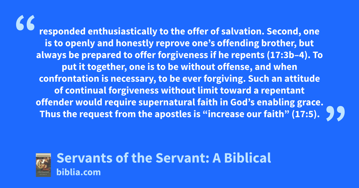 responded enthusiastically to the offer of salvation. Second, one is to openly and honestly reprove one’s offending brother, but always be prepared to offer forgiveness if he repents (17:3b–4). To put it together, one is to be without offense, and when confrontation is necessary, to be ever forgiving. Such an attitude of continual forgiveness without limit toward a repentant offender would require supernatural faith in God’s enabling grace. Thus the request from the apostles is “increase our faith” (17:5).