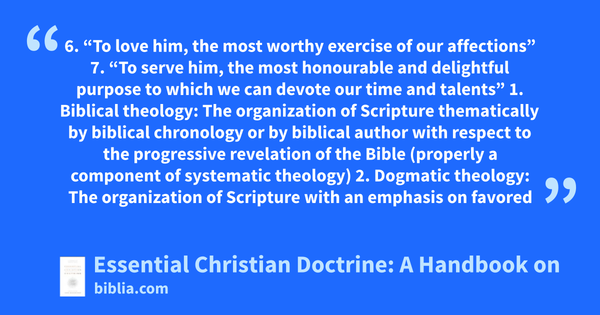 6. “To love him, the most worthy exercise of our affections” 7. “To serve him, the most honourable and delightful purpose to which we can devote our time and talents” 1. Biblical theology: The organization of Scripture thematically by biblical chronology or by biblical author with respect to the progressive revelation of the Bible (properly a component of systematic theology) 2. Dogmatic theology: The organization of Scripture with an emphasis on favored