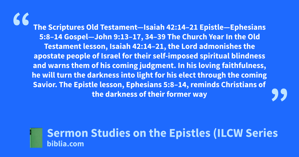 The Scriptures Old Testament—Isaiah 42:14–21 Epistle—Ephesians 5:8–14 Gospel—John 9:13–17, 34–39 The Church Year In the Old Testament lesson, Isaiah 42:14–21, the Lord admonishes the apostate people of Israel for their self-imposed spiritual blindness and warns them of his coming judgment. In his loving faithfulness, he will turn the darkness into light for his elect through the coming Savior. The Epistle lesson, Ephesians 5:8–14, reminds Christians of the darkness of their former way