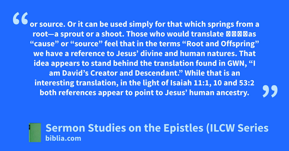 or source. Or it can be used simply for that which springs from a root—a sprout or a shoot. Those who would translate ῥίζαas “cause” or “source” feel that in the terms “Root and Offspring” we have a reference to Jesus’ divine and human natures. That idea appears to stand behind the translation found in GWN, “I am David’s Creator and Descendant.” While that is an interesting translation, in the light of Isaiah 11:1, 10 and 53:2 both references appear to point to Jesus’ human ancestry.