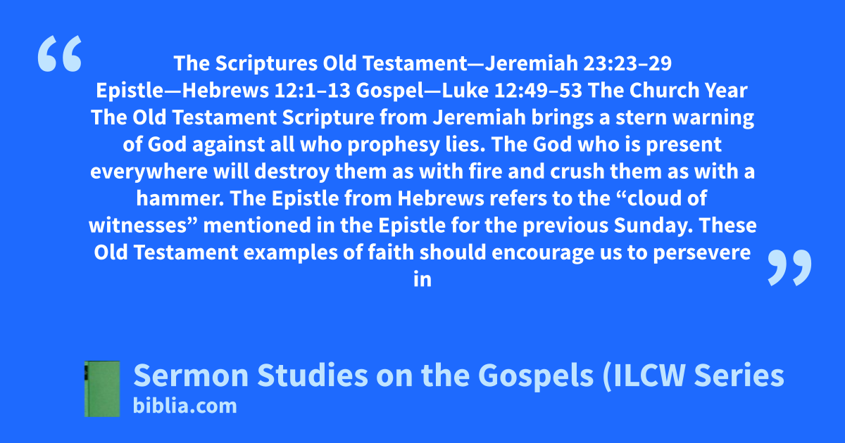The Scriptures Old Testament—Jeremiah 23:23–29 Epistle—Hebrews 12:1–13 Gospel—Luke 12:49–53 The Church Year The Old Testament Scripture from Jeremiah brings a stern warning of God against all who prophesy lies. The God who is present everywhere will destroy them as with fire and crush them as with a hammer. The Epistle from Hebrews refers to the “cloud of witnesses” mentioned in the Epistle for the previous Sunday. These Old Testament examples of faith should encourage us to persevere in