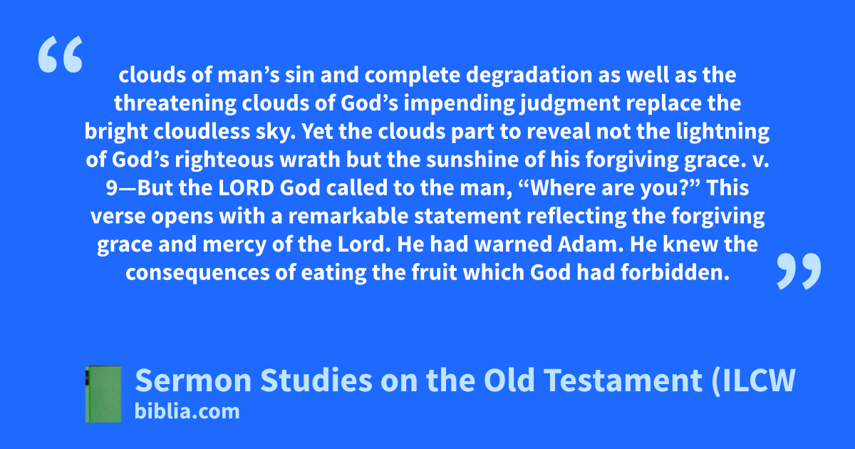 clouds of man’s sin and complete degradation as well as the threatening clouds of God’s impending judgment replace the bright cloudless sky. Yet the clouds part to reveal not the lightning of God’s righteous wrath but the sunshine of his forgiving grace. v. 9—But the LORD God called to the man, “Where are you?” This verse opens with a remarkable statement reflecting the forgiving grace and mercy of the Lord. He had warned Adam. He knew the consequences of eating the fruit which God had forbidden.