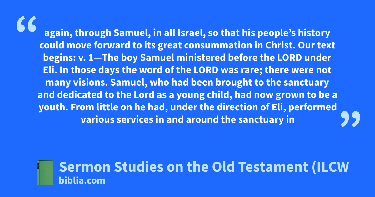 again, through Samuel, in all Israel, so that his people’s history could move forward to its great consummation in Christ. Our text begins: v. 1—The boy Samuel ministered before the LORD under Eli. In those days the word of the LORD was rare; there were not many visions. Samuel, who had been brought to the sanctuary and dedicated to the Lord as a young child, had now grown to be a youth. From little on he had, under the direction of Eli, performed various services in and around the sanctuary in