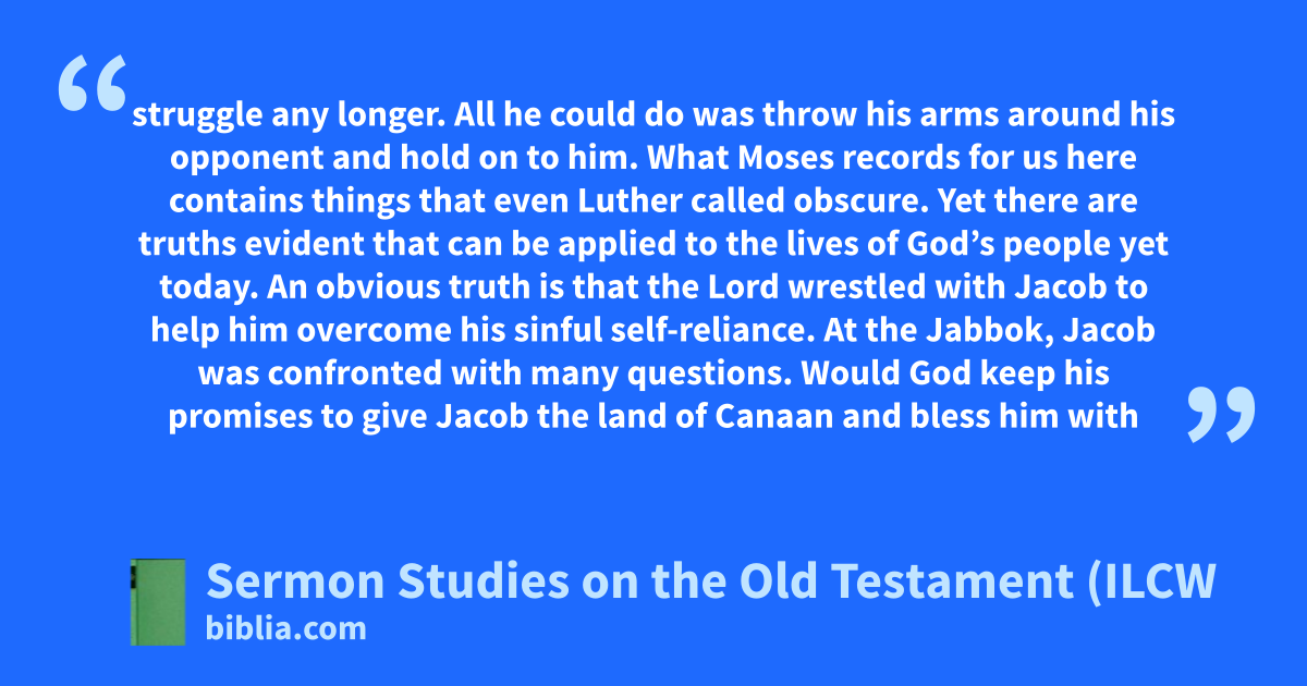 struggle any longer. All he could do was throw his arms around his opponent and hold on to him. What Moses records for us here contains things that even Luther called obscure. Yet there are truths evident that can be applied to the lives of God’s people yet today. An obvious truth is that the Lord wrestled with Jacob to help him overcome his sinful self-reliance. At the Jabbok, Jacob was confronted with many questions. Would God keep his promises to give Jacob the land of Canaan and bless him with