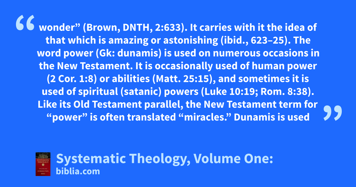 wonder” (Brown, DNTH, 2:633). It carries with it the idea of that which is amazing or astonishing (ibid., 623–25). The word power (Gk: dunamis) is used on numerous occasions in the New Testament. It is occasionally used of human power (2 Cor. 1:8) or abilities (Matt. 25:15), and sometimes it is used of spiritual (satanic) powers (Luke 10:19; Rom. 8:38). Like its Old Testament parallel, the New Testament term for “power” is often translated “miracles.” Dunamis is used