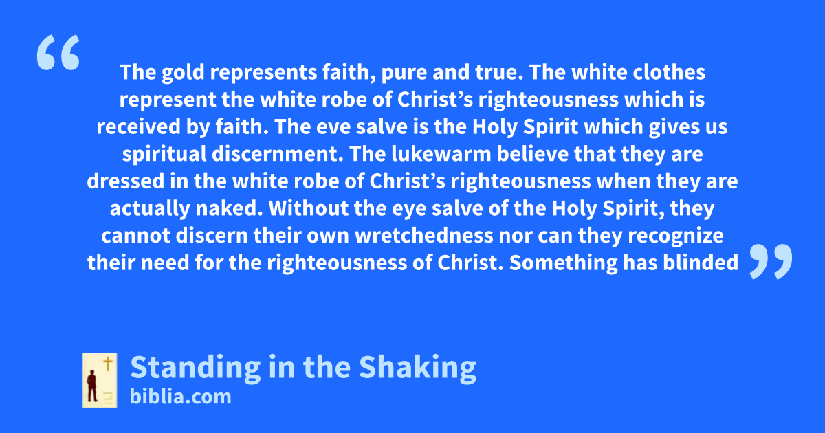 The gold represents faith, pure and true. The white clothes represent the white robe of Christ’s righteousness which is received by faith. The eve salve is the Holy Spirit which gives us spiritual discernment. The lukewarm believe that they are dressed in the white robe of Christ’s righteousness when they are actually naked. Without the eye salve of the Holy Spirit, they cannot discern their own wretchedness nor can they recognize their need for the righteousness of Christ. Something has blinded