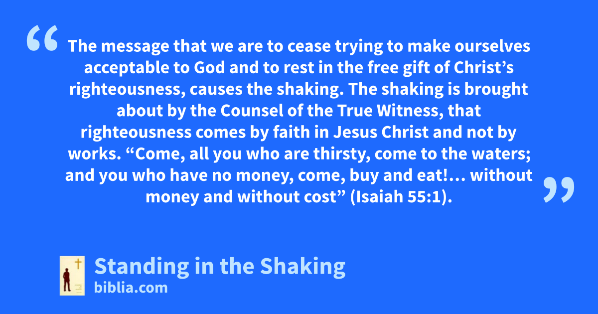 The message that we are to cease trying to make ourselves acceptable to God and to rest in the free gift of Christ’s righteousness, causes the shaking. The shaking is brought about by the Counsel of the True Witness, that righteousness comes by faith in Jesus Christ and not by works. “Come, all you who are thirsty, come to the waters; and you who have no money, come, buy and eat!… without money and without cost” (Isaiah 55:1).