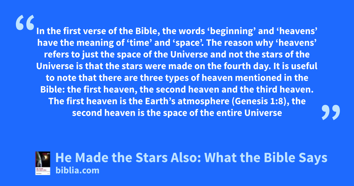 In the first verse of the Bible, the words ‘beginning’ and ‘heavens’ have the meaning of ‘time’ and ‘space’. The reason why ‘heavens’ refers to just the space of the Universe and not the stars of the Universe is that the stars were made on the fourth day. It is useful to note that there are three types of heaven mentioned in the Bible: the first heaven, the second heaven and the third heaven. The first heaven is the Earth’s atmosphere (Genesis 1:8), the second heaven is the space of the entire Universe