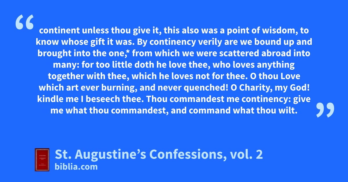 continent unless thou give it, this also was a point of wisdom, to know whose gift it was. By continency verily are we bound up and brought into the one,* from which we were scattered abroad into many: for too little doth he love thee, who loves anything together with thee, which he loves not for thee. O thou Love which art ever burning, and never quenched! O Charity, my God! kindle me I beseech thee. Thou commandest me continency: give me what thou commandest, and command what thou wilt.