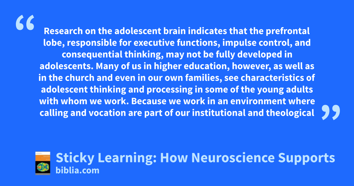 Research on the adolescent brain indicates that the prefrontal lobe, responsible for executive functions, impulse control, and consequential thinking, may not be fully developed in adolescents. Many of us in higher education, however, as well as in the church and even in our own families, see characteristics of adolescent thinking and processing in some of the young adults with whom we work. Because we work in an environment where calling and vocation are part of our institutional and theological
