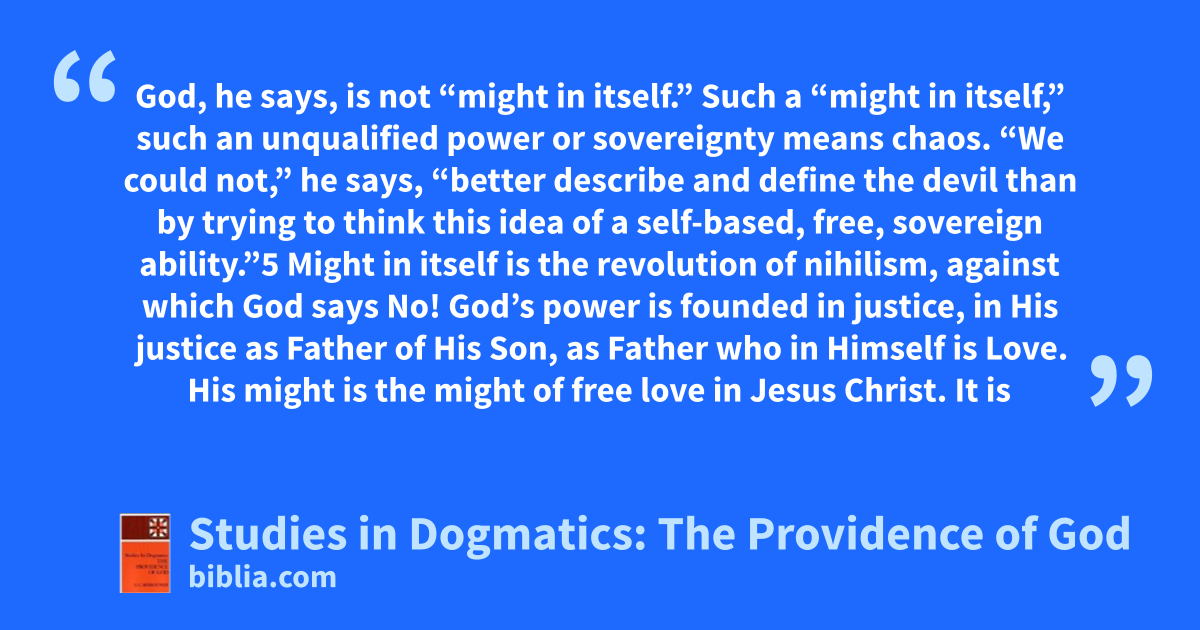 God, he says, is not “might in itself.” Such a “might in itself,” such an unqualified power or sovereignty means chaos. “We could not,” he says, “better describe and define the devil than by trying to think this idea of a self-based, free, sovereign ability.”5 Might in itself is the revolution of nihilism, against which God says No! God’s power is founded in justice, in His justice as Father of His Son, as Father who in Himself is Love. His might is the might of free love in Jesus Christ. It is