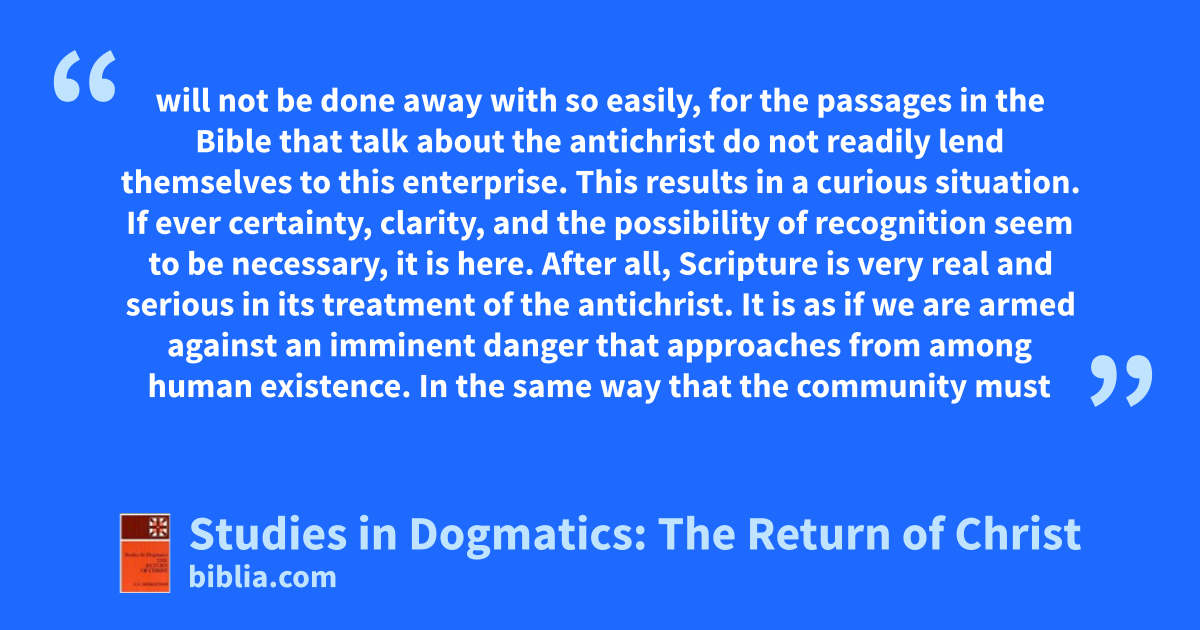 will not be done away with so easily, for the passages in the Bible that talk about the antichrist do not readily lend themselves to this enterprise. This results in a curious situation. If ever certainty, clarity, and the possibility of recognition seem to be necessary, it is here. After all, Scripture is very real and serious in its treatment of the antichrist. It is as if we are armed against an imminent danger that approaches from among human existence. In the same way that the community must