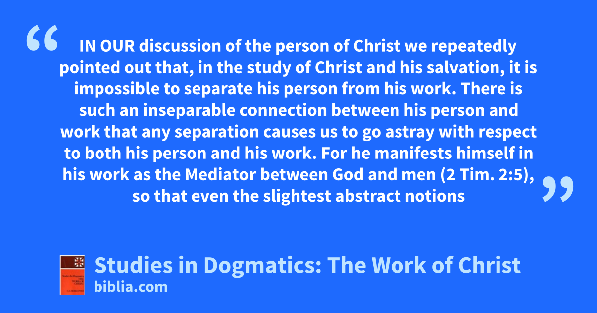 IN OUR discussion of the person of Christ we repeatedly pointed out that, in the study of Christ and his salvation, it is impossible to separate his person from his work. There is such an inseparable connection between his person and work that any separation causes us to go astray with respect to both his person and his work. For he manifests himself in his work as the Mediator between God and men (2 Tim. 2:5), so that even the slightest abstract notions