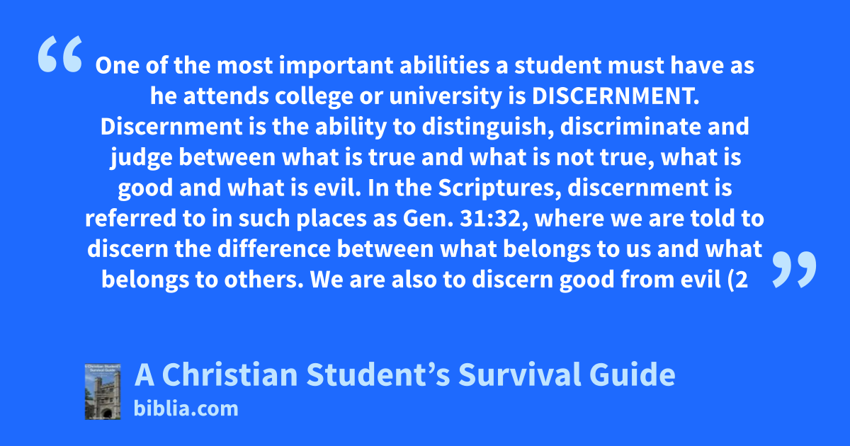 One of the most important abilities a student must have as he attends college or university is DISCERNMENT. Discernment is the ability to distinguish, discriminate and judge between what is true and what is not true, what is good and what is evil. In the Scriptures, discernment is referred to in such places as Gen. 31:32, where we are told to discern the difference between what belongs to us and what belongs to others. We are also to discern good from evil (2