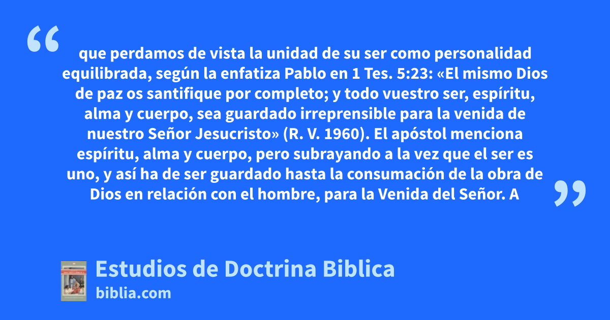 que perdamos de vista la unidad de su ser como personalidad equilibrada, según la enfatiza Pablo en 1 Tes. 5:23: «El mismo Dios de paz os santifique por completo; y todo vuestro ser, espíritu, alma y cuerpo, sea guardado irreprensible para la venida de nuestro Señor Jesucristo» (R. V. 1960). El apóstol menciona espíritu, alma y cuerpo, pero subrayando a la vez que el ser es uno, y así ha de ser guardado hasta la consumación de la obra de Dios en relación con el hombre, para la Venida del Señor. A
