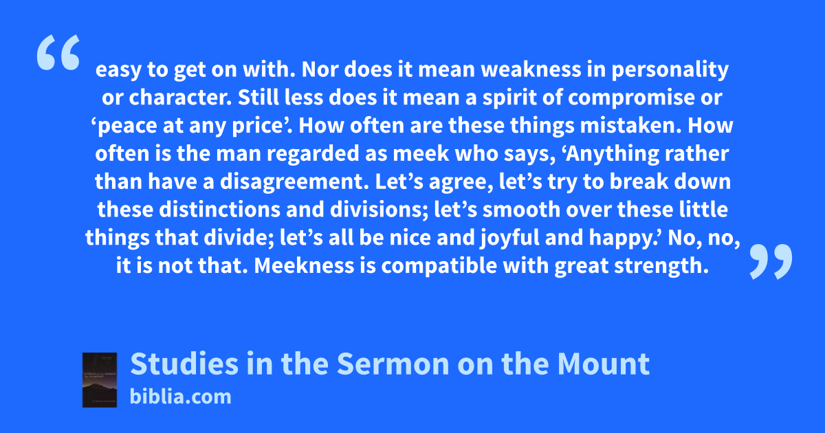 easy to get on with. Nor does it mean weakness in personality or character. Still less does it mean a spirit of compromise or ‘peace at any price’. How often are these things mistaken. How often is the man regarded as meek who says, ‘Anything rather than have a disagreement. Let’s agree, let’s try to break down these distinctions and divisions; let’s smooth over these little things that divide; let’s all be nice and joyful and happy.’ No, no, it is not that. Meekness is compatible with great strength.