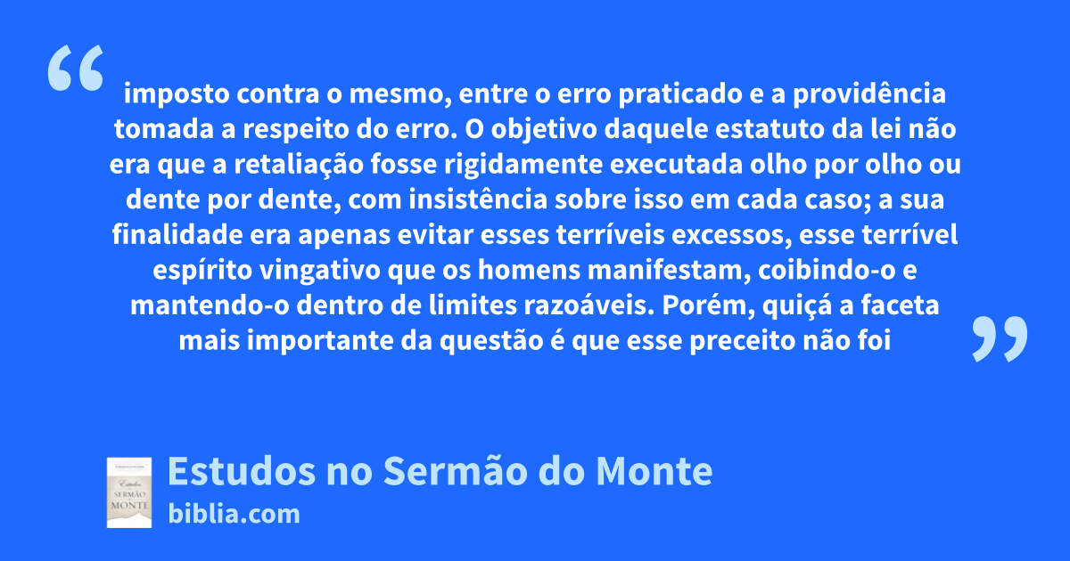 imposto contra o mesmo, entre o erro praticado e a providência tomada a respeito do erro. O objetivo daquele estatuto da lei não era que a retaliação fosse rigidamente executada olho por olho ou dente por dente, com insistência sobre isso em cada caso; a sua finalidade era apenas evitar esses terríveis excessos, esse terrível espírito vingativo que os homens manifestam, coibindo-o e mantendo-o dentro de limites razoáveis. Porém, quiçá a faceta mais importante da questão é que esse preceito não foi
