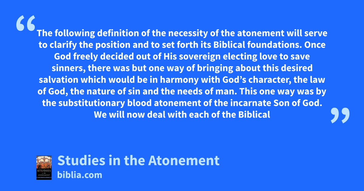 The following definition of the necessity of the atonement will serve to clarify the position and to set forth its Biblical foundations. Once God freely decided out of His sovereign electing love to save sinners, there was but one way of bringing about this desired salvation which would be in harmony with God’s character, the law of God, the nature of sin and the needs of man. This one way was by the substitutionary blood atonement of the incarnate Son of God. We will now deal with each of the Biblical