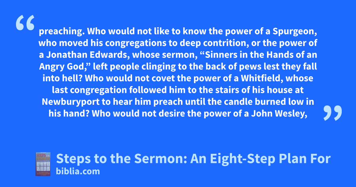 preaching. Who would not like to know the power of a Spurgeon, who moved his congregations to deep contrition, or the power of a Jonathan Edwards, whose sermon, “Sinners in the Hands of an Angry God,” left people clinging to the back of pews lest they fall into hell? Who would not covet the power of a Whitfield, whose last congregation followed him to the stairs of his house at Newburyport to hear him preach until the candle burned low in his hand? Who would not desire the power of a John Wesley,