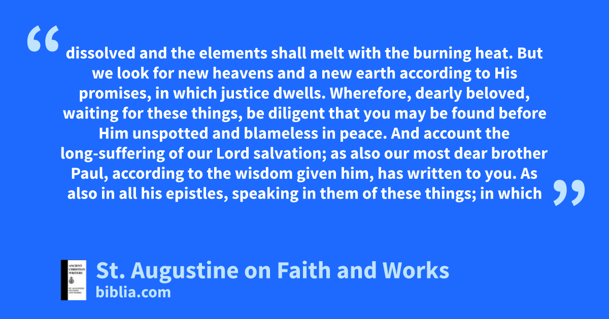 dissolved and the elements shall melt with the burning heat. But we look for new heavens and a new earth according to His promises, in which justice dwells. Wherefore, dearly beloved, waiting for these things, be diligent that you may be found before Him unspotted and blameless in peace. And account the long-suffering of our Lord salvation; as also our most dear brother Paul, according to the wisdom given him, has written to you. As also in all his epistles, speaking in them of these things; in which