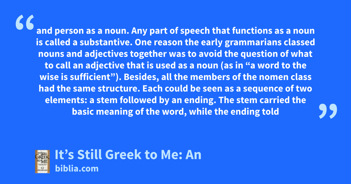 According to David Alan Black, people who teach or write about Greek grammar tend to treat the subject as though it were a green vegetable: “you may not like grammar, but it’s good for you.” It’s Still Greek to Me offers an alternative approach. “I have tried to organize the book in a manner geared to the way people actually use the language, and I have done my utmost to make this book not only...