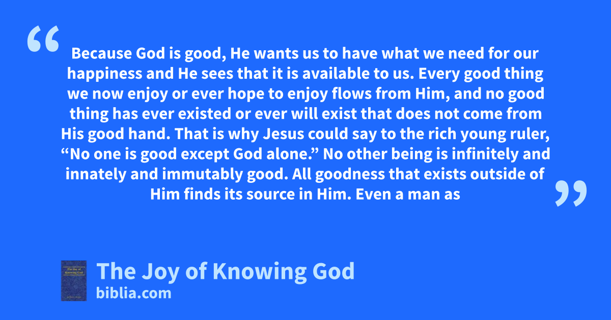 Because God is good, He wants us to have what we need for our happiness and He sees that it is available to us. Every good thing we now enjoy or ever hope to enjoy flows from Him, and no good thing has ever existed or ever will exist that does not come from His good hand. That is why Jesus could say to the rich young ruler, “No one is good except God alone.” No other being is infinitely and innately and immutably good. All goodness that exists outside of Him finds its source in Him. Even a man as