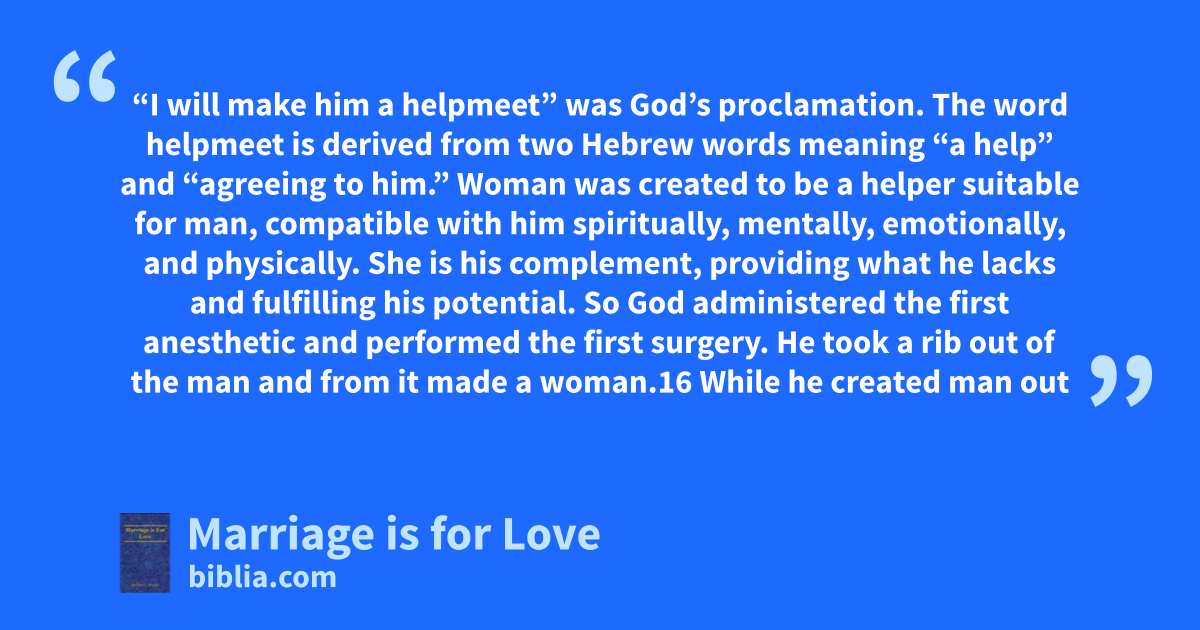 “I will make him a helpmeet” was God’s proclamation. The word helpmeet is derived from two Hebrew words meaning “a help” and “agreeing to him.” Woman was created to be a helper suitable for man, compatible with him spiritually, mentally, emotionally, and physically. She is his complement, providing what he lacks and fulfilling his potential. So God administered the first anesthetic and performed the first surgery. He took a rib out of the man and from it made a woman.16 While he created man out